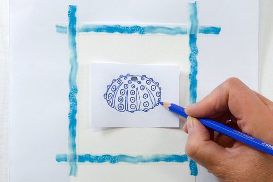 1. Töltsük le innen a tengericsillag mintát, és nyomtassuk ki. Árnyékoljuk a sablon hátulját a sötétkék akvarell ceruzával. Helyezzük a sablont (az előlappal felfelé) pontosan az akvarellpapír közepére. Az akvarellceruzával rajzoljuk le a körvonalakat és a vonalakat. Ezzel a motívumot átvisszük a papírra. Mielőtt eltávolítaná a sablont, ellenőrizze, hogy minden vonal átkerült-e.
