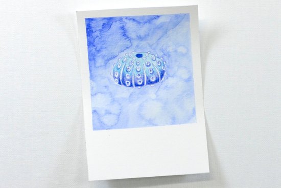 3. Árnyékoljuk sötétkékkel a tengeri sün körüli területet. Fessük meg a hátteret az akvarell ecsettel. Ha élénk hátteret szeretnénk, cseppentsünk vízcseppeket a kissé nedves színbe.