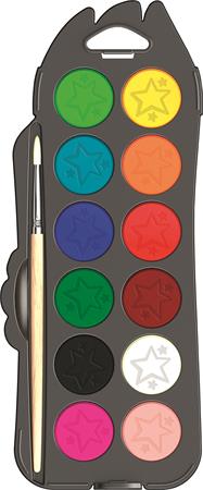 kiváló minőségű vízfesték különböző mennyiségű víz hozzáadásával többféle hatás érhető el a doboz 12 féle színt és egy ecsetet tartalmaz korongok átmérője: 30 mm praktikus méretű, bliszteres kiszerelése miatt könnyen tárolható