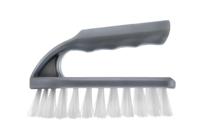Fogantyús műanyag súroló kefe, műanyag szálakkal, nélkülözhetetlen takarítóeszköz a foltok és szennyeződések eltávolításához.