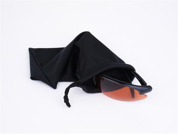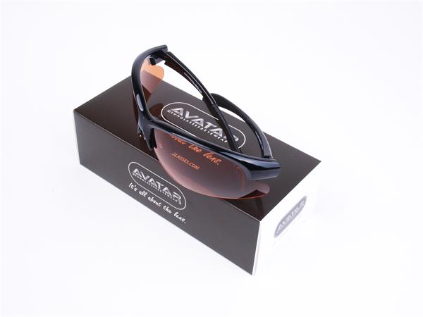 Sportnapszemüveg borostyánszínű HD és polarizált lencsével, fekete műanyag kerettel.